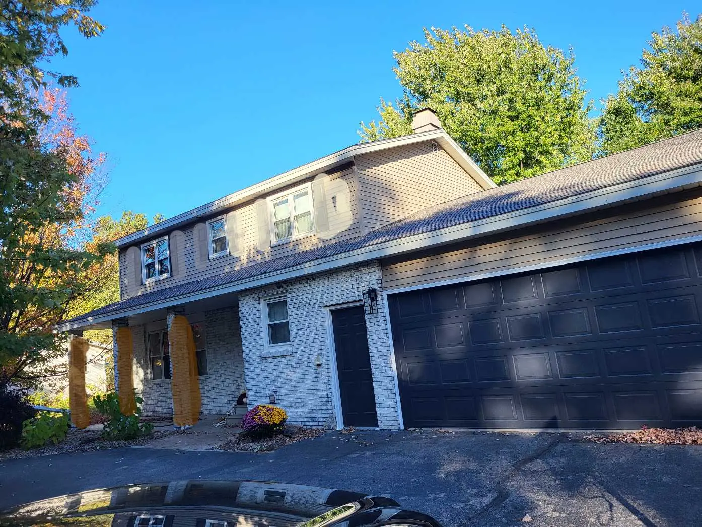 The proposed remodel focuses on enhancing the curb appeal of the two-story home through modern design elements while adhering to a budget of under $5000 and a timeline of over 6 months. The existing beige siding and brick facade are updated with a contemporary color scheme of light gray siding and a light, neutral paint for the brick, creating a cohesive look. Natural wood accents are introduced through sleek, modern beams supporting the front porch roof, replacing the outdated columns. These beams are approximately 8 inches wide and spaced 6 feet apart. The garage door is replaced with a modern, insulated door featuring horizontal panels in a dark charcoal gray, measuring approximately 16 feet wide and 7 feet tall. New, energy-efficient windows with black frames are installed throughout the house, enhancing energy efficiency and complementing the modern aesthetic; each window is roughly 3 feet by 4 feet. The landscaping is refreshed with low-maintenance native plants and a minimalist walkway leading to the front door, improving the overall aesthetics without significant cost. The house’s visible area is approximately 30 feet wide and 25 feet tall, ensuring that the improvements are visually impactful and proportionate.