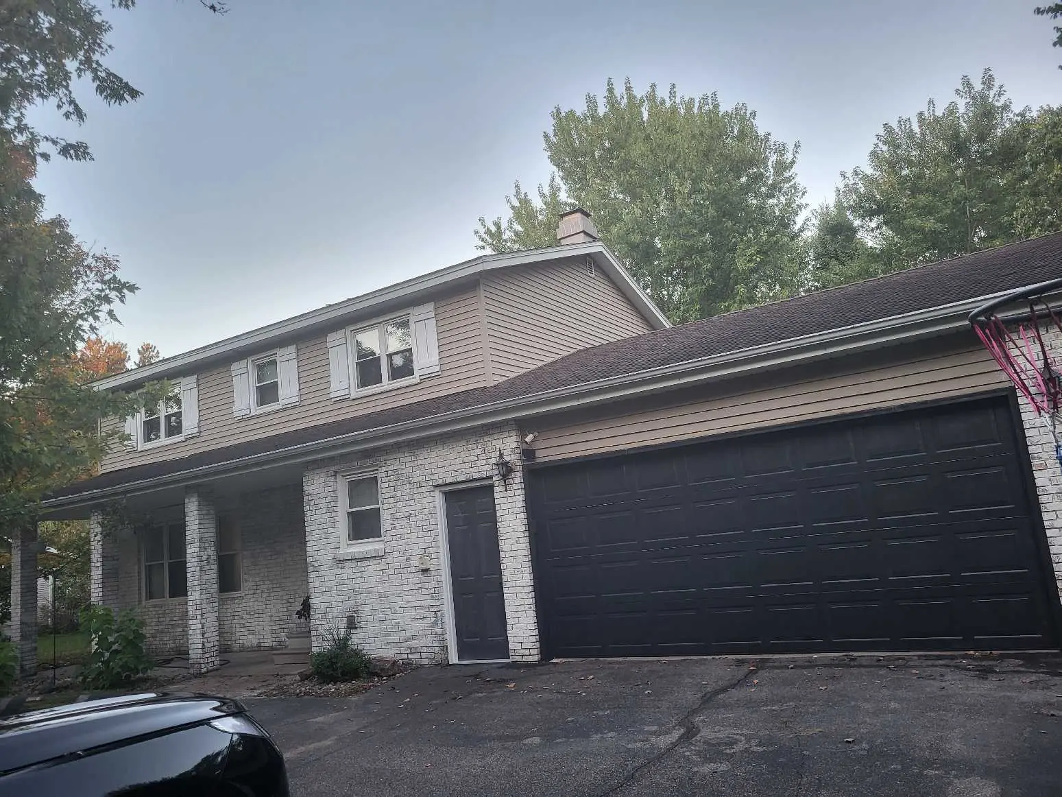 Suggested Exterior Improvements: Paint the Brick: Whitewash the existing brick for a modern, clean look. Garage Door & Front Door: Replace with a modern, dark grey garage door with recessed panels and a matching front door. Siding: Update the upper level with light grey siding. Shutters: Paint the shutters a deep teal for a pop of color. Porch Columns: Replace the existing columns with sleek, square wooden posts. Pergola: Add a wooden pergola above the garage door with climbing vines. Lighting: Install modern exterior lighting fixtures. Landscaping: Implement low-maintenance shrubs and ornamental grasses. Driveway: Freshly paved asphalt driveway.