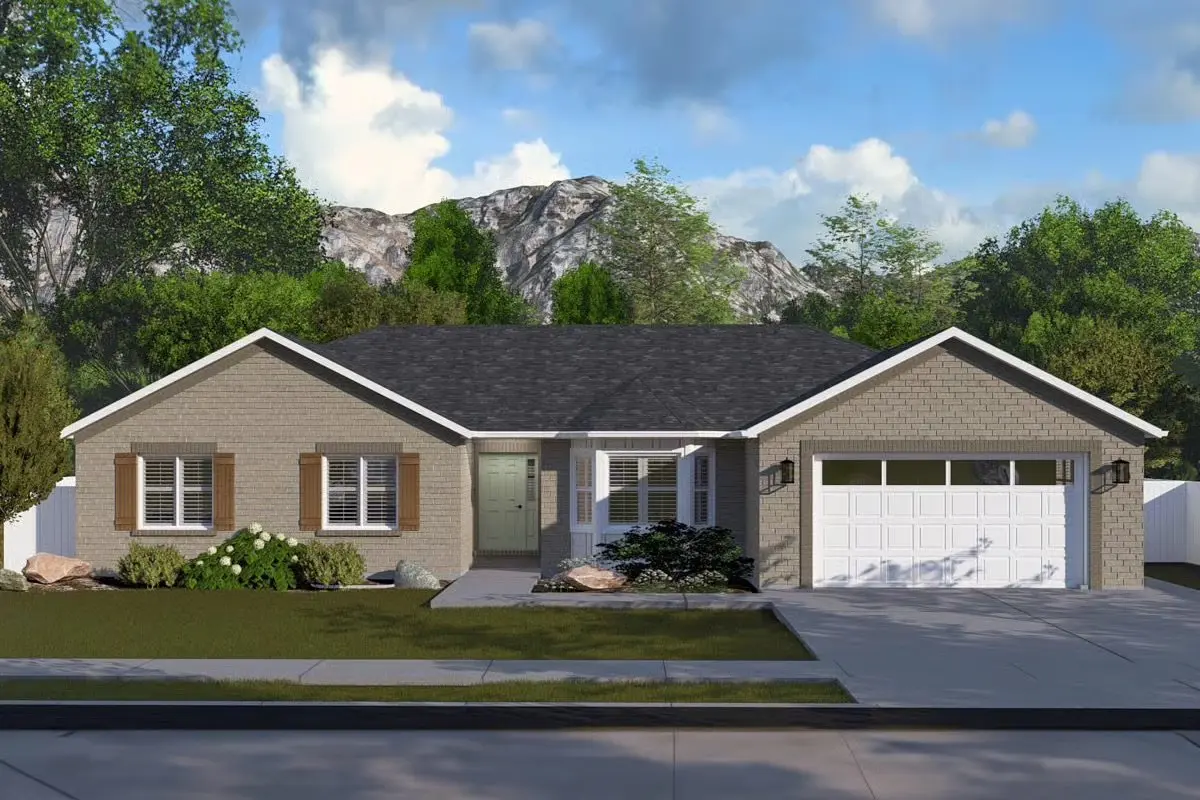 The proposed remodel involves transforming the existing exterior into a modern European cottage style. The house will feature light tan vertical siding complemented by light stone accents to enhance its aesthetic appeal. A wooden front door and garage door will add warmth and character. Black-framed windows contribute to a sleek appearance, while an additional peak over the front door introduces architectural interest. Landscaping will be revitalized to include manicured gardens and a defined front path. This design will maintain the house’s approximate size of 1500 square feet, optimizing both function and aesthetics.