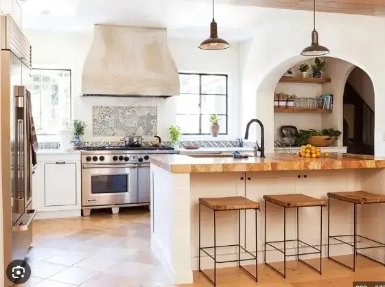 Suggested Changes Install a large island with quartz countertops. Update to shaker-style light oak cabinets. Integrate stainless steel appliances. Add open shelving with LED lighting. Include a decorative tile backsplash. Maximize natural light with large windows and French doors. Enhance with industrial lighting and potted plants.